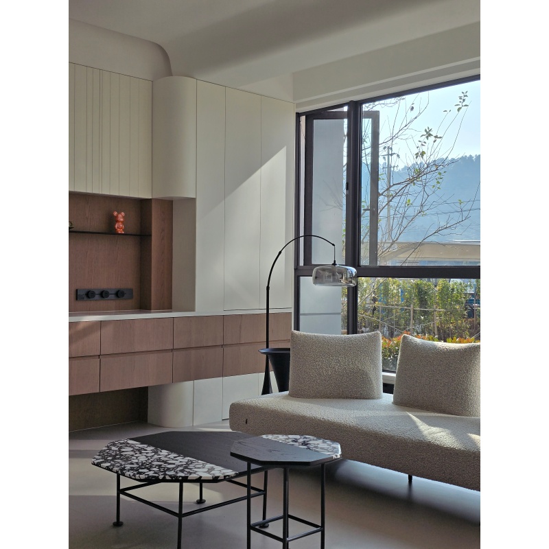 水磨石和木头的结合可谓别出心裁,有石头的润也有木质的雅