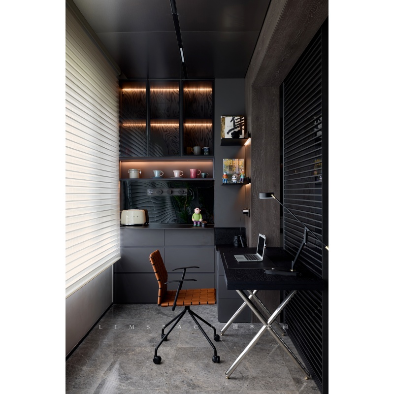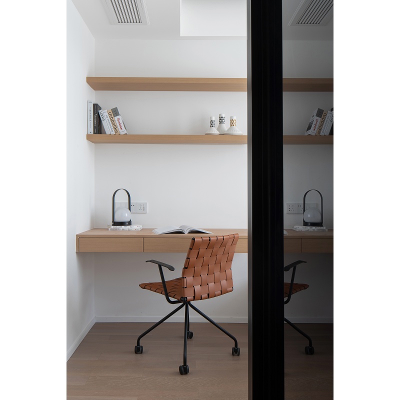 一款带万向轮的椅子,马鞍皮编织和金属椅架的结合有着一些复古